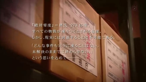 「絕對零度=攝氏溫度=-273.15度,是能將一切物質凍結的溫度,但是在現實中卻不可能達到的。任何案件都不會完全凍結,未結案件也不會就此結束,我對此深信不疑。」這是本劇對劇名的解釋。